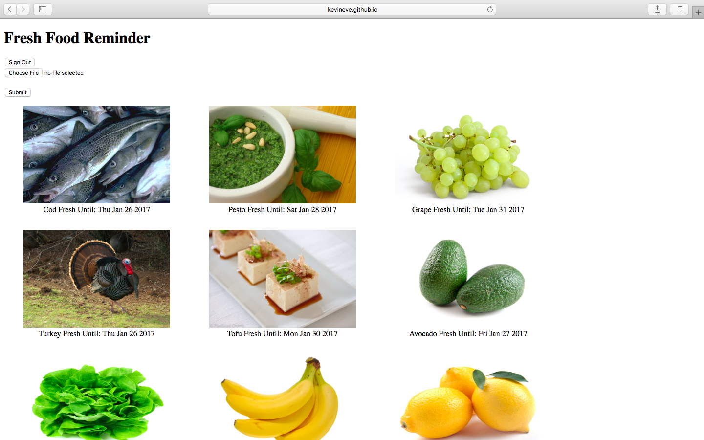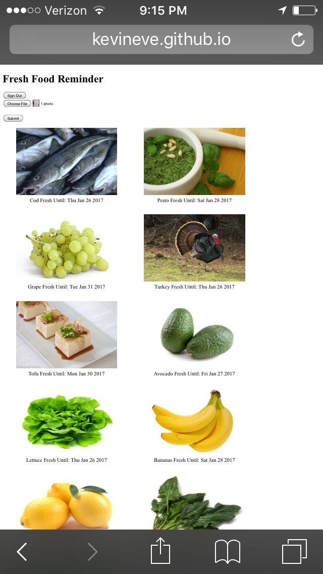 I wrote a website to track fresh produce in my refrigerator. Food items are loaded from images of grocery store receipts taken with a smartphone camera. The image is sent to Google Cloud Engine which converts the image to text. This text is cross referenced for with a list of list of food items and shelf life. The list of food items was scraped from a website stilltasty.com using a python script. The food items matched from grocery store receipts are displayed on the website along with an image of the food sourced from the Bing Image Search API. The database for the food items is a personal Google Sheet updated by the Sheets API. The website is written in front end javascript and html and hosted on github (link to code). All of the hosting and API requests were done using free services or free trials for paid services. This project was completed for a course ENGN 1931Z at Brown University.